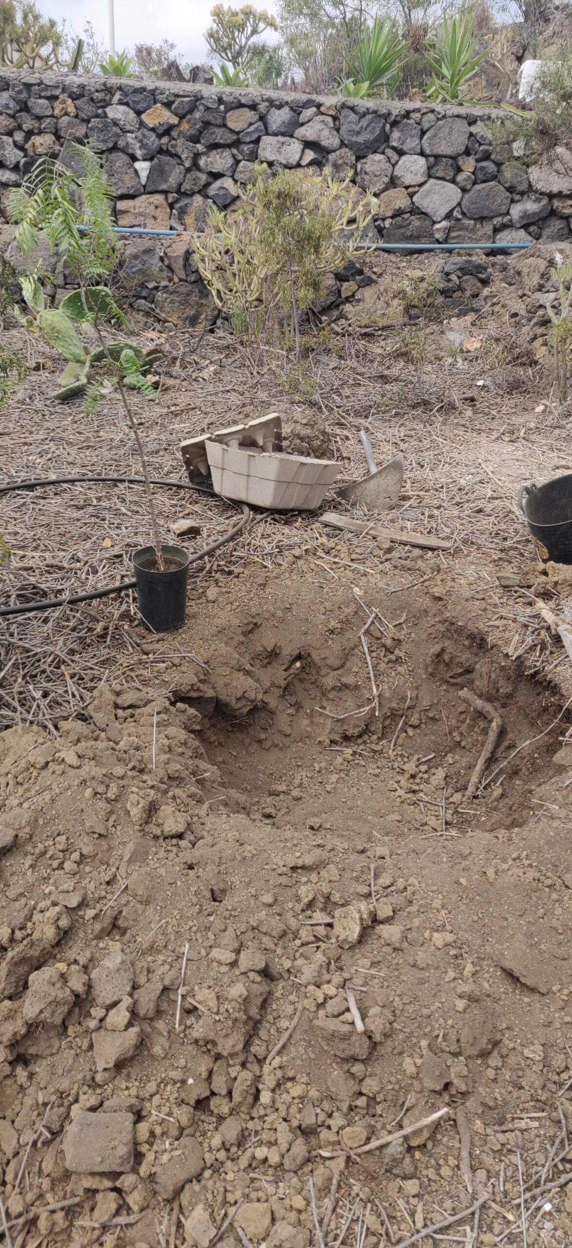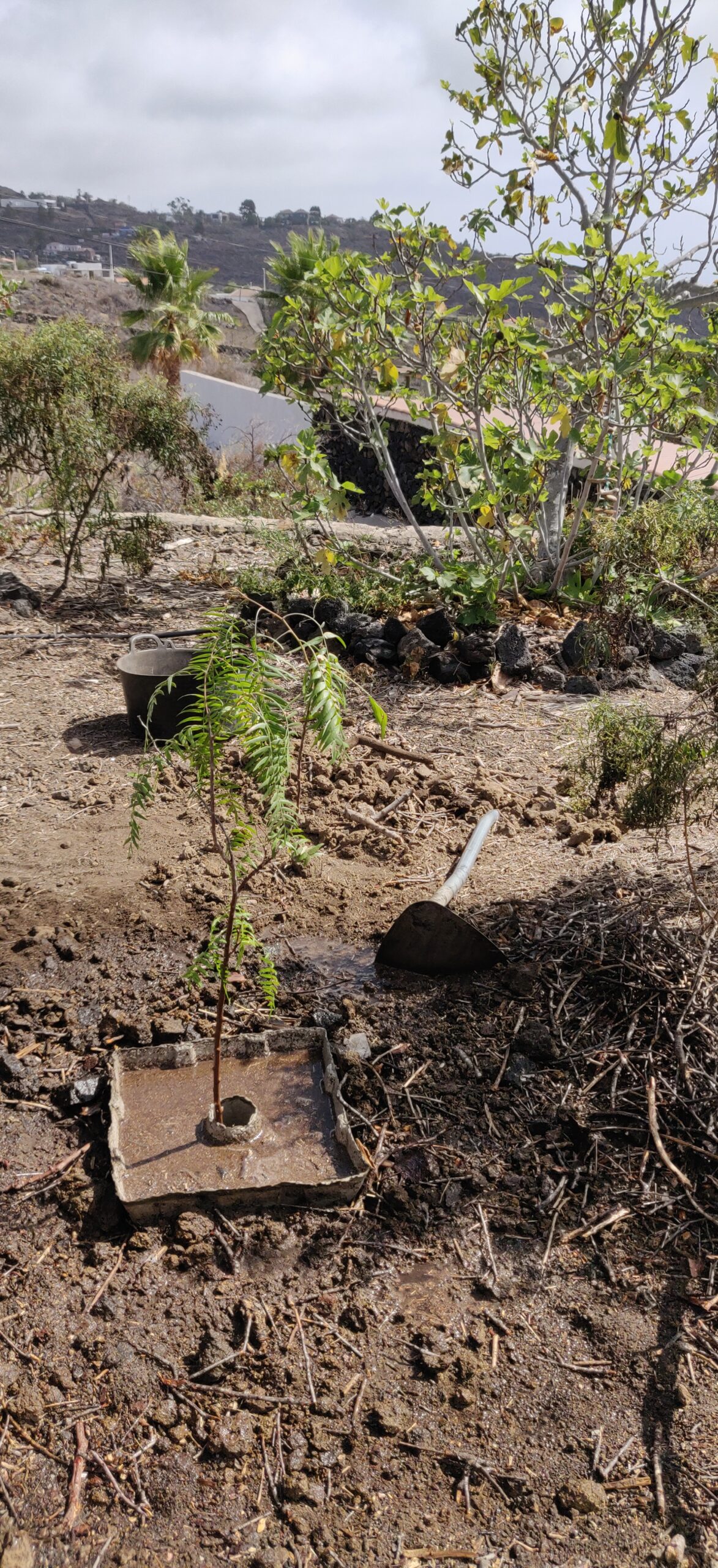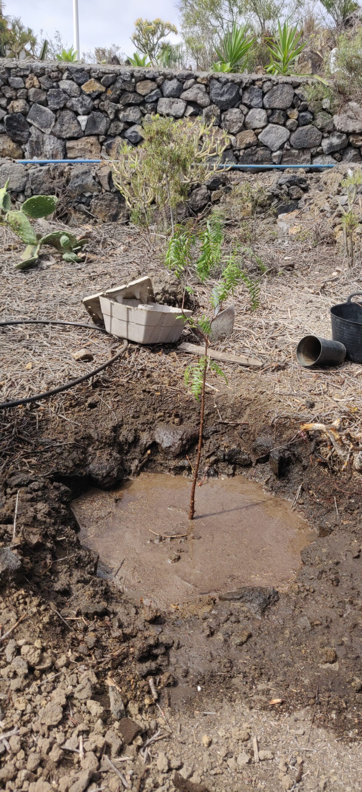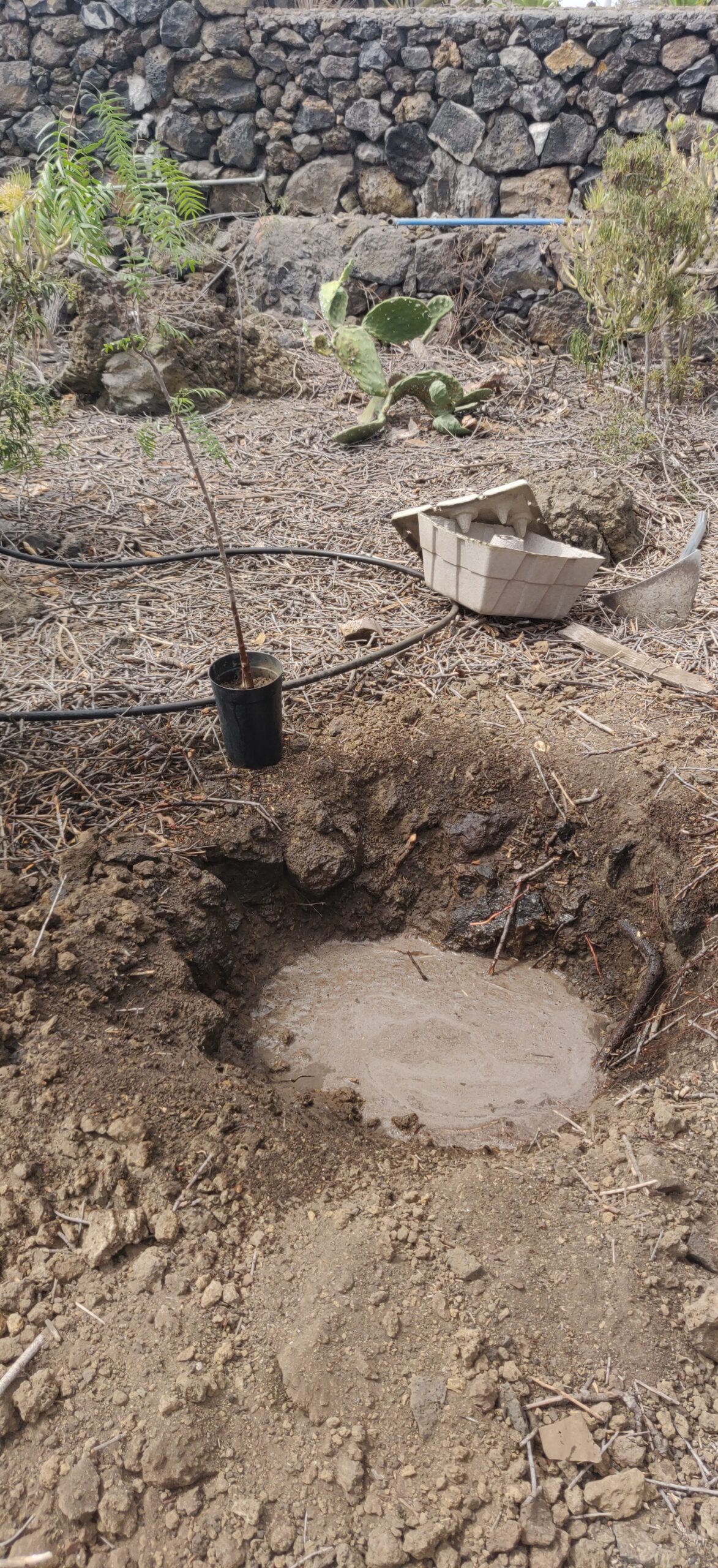 Einen Baum bei 200-300 mm Regen pro Jahr zu pflanzen ist ein schwieriges Unterfangen. Insbesondere, wenn man nicht immer da ist. Am Anfang war das Problem, dass weder Strom noch ein Wasseranschluss existierten. Einzig in der Zisterne waren noch einige 1000L Wasser vorhanden, welches von Hand geschöpft werden musste. Dennoch war es das Ziel, möglichst schnell mit dem Wiederaufbau das Garten anzufangen, um schnell Schatten und Früchte zu produzieren. Die Finca sieht natürlich mit einem grünen Garten auch besser aus.