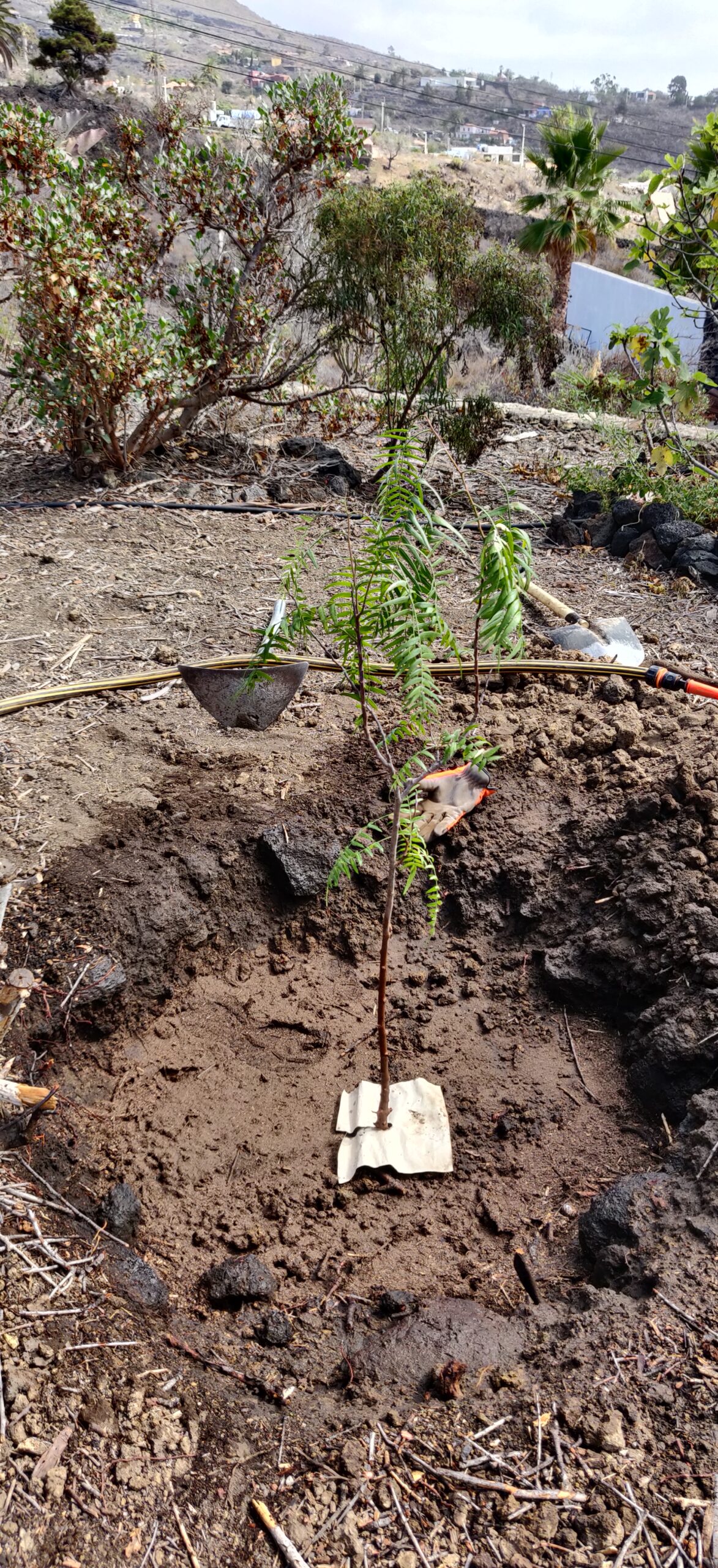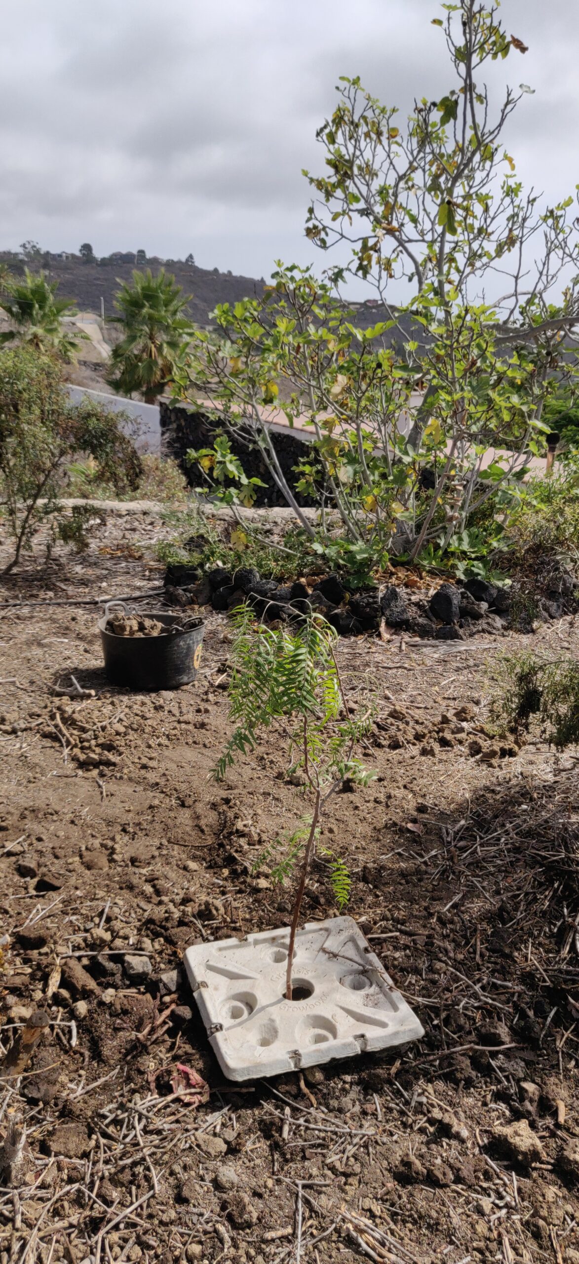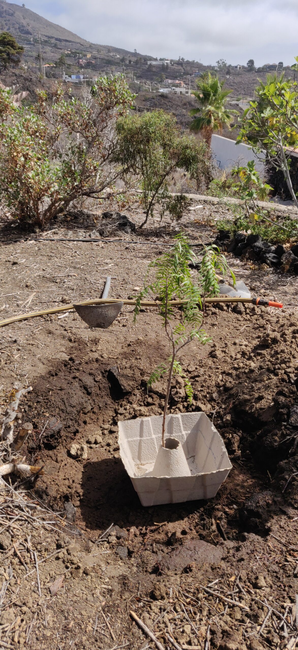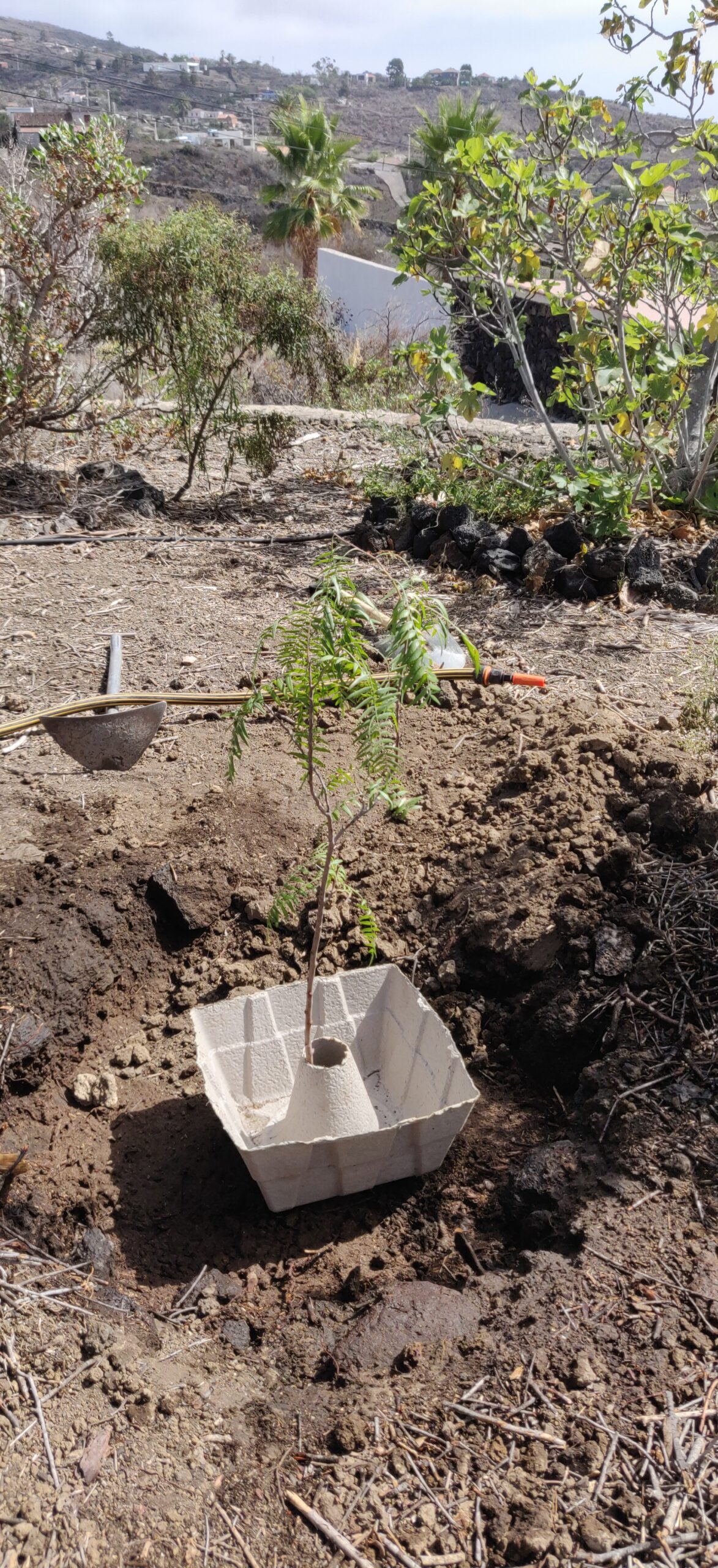 Einen Baum bei 200-300 mm Regen pro Jahr zu pflanzen ist ein schwieriges Unterfangen. Insbesondere, wenn man nicht immer da ist. Am Anfang war das Problem, dass weder Strom noch ein Wasseranschluss existierten. Einzig in der Zisterne waren noch einige 1000L Wasser vorhanden, welches von Hand geschöpft werden musste. Dennoch war es das Ziel, möglichst schnell mit dem Wiederaufbau das Garten anzufangen, um schnell Schatten und Früchte zu produzieren. Die Finca sieht natürlich mit einem grünen Garten auch besser aus.