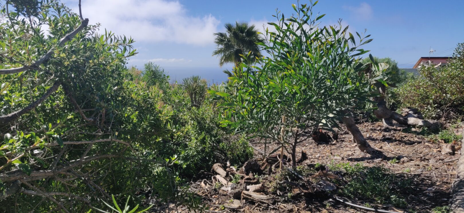 - Bestehende Pflanzen oder Wurzeln wieder beleben, insbesondere die grosse Palme beim Haus und die alten Mandelbäume